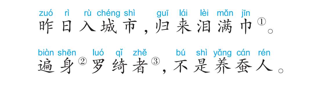 昨天我进城去卖蚕茧,回到家时,汗巾已被眼泪打湿了。城里那些全身穿着绫罗绸缎的人,都不是养蚕人啊!