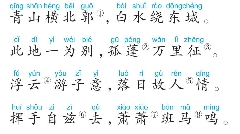 青翠的山峦横卧在城墙的北面,清澈的流水绕着城东潺潺而过。就在此地我们相互道别,你就像那孤蓬随风飘荡到万里之外。浮云像游子一样行踪不定,太阳缓缓落山像我一样依依不舍。彼此挥手,从此别离,友人骑行的马儿萧萧长鸣,似乎不忍离去。