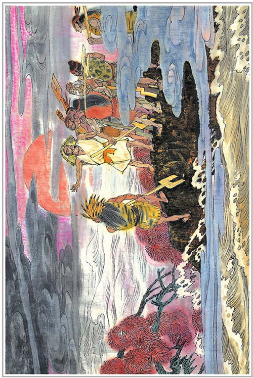 尧召开部落联盟会议,商量治水的问题。他征求四方部落首领的意见:派谁去治理洪水呢?首领们都推荐鲧(音ɡǔn)。