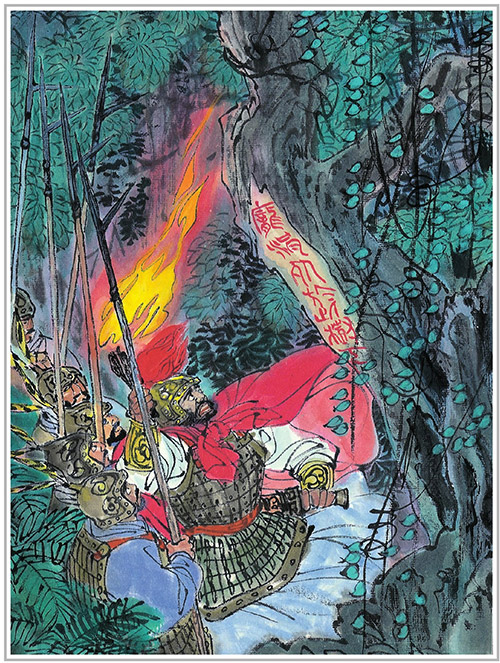 庞涓叫兵士拿火来照。有几个兵士点起火把来。趁着火光一瞧,那树瓤上面写的是:“庞涓死于此树下。”