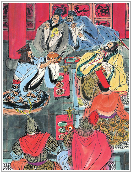 赵惠文王气得脸都发紫了。正在这时候,蔺相如拿了一个缶(音fǒu,一种瓦器,可以打击配乐),突然跪到秦昭襄王跟前,说:“赵王听说秦王挺会秦国的乐器。我这里有个瓦盆,也请大王赏脸敲几下助兴吧。”