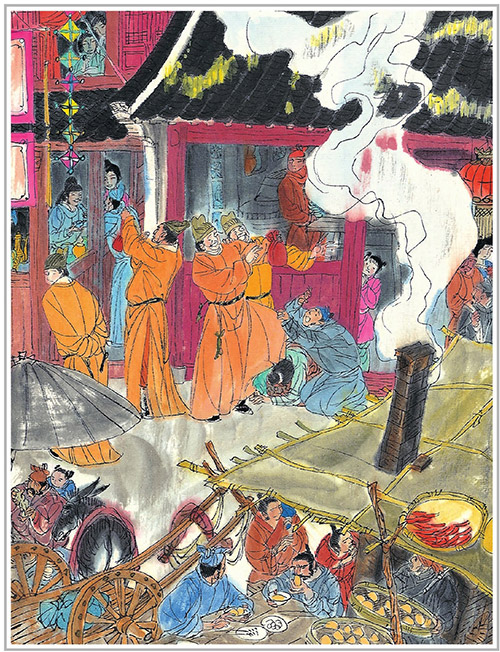 店主人吓得要命,苦苦哀求五坊小儿把蛇带走,至于酒钱,当然不敢再要了。