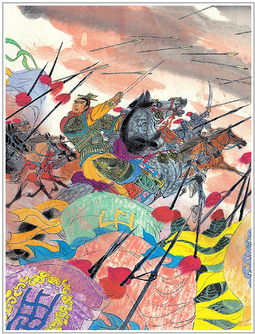 刘崇指挥北汉军猛攻周军,周军右军的将领顶不住,带领骑兵败了下来,步兵也纷纷投降。眼看情况十分危急,周世宗亲自上阵,冒着乱箭督战。他的两名将领赵匡胤(音yìn)和张永德各带领两千亲兵冲进敌阵。周军兵士看到周世宗沉着应战,也奋勇冲杀,一个抵上一百个,争先恐后地冲向敌阵。北汉兵就像山崩一样败了下来。