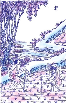 凡稻分秧之后数日,旧叶萎黄而更生新叶。青叶既长,则耔俗名挞禾可施焉。植杖于手,以足扶泥壅根,并屈宿田水草,使不生也。凡宿田菵草之类,遇耔而屈折。而稊、稗与荼、蓼,非足力所可除者,则耘以继之。耘者苦在腰手,辨在两眸。非类既去,而嘉谷茂焉。从此泄以防潦,溉以防旱,旬月而“奄观铚刈”矣。