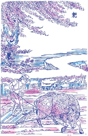 凡牛力穷者,两人以杠悬耜,项背相望而起土,两人竟日仅敌一牛之力。若耕后牛穷,制成磨耙,两人肩手磨轧,则一日敌三牛之力也。凡牛,中国惟水、黄两种,水牛力倍于黄。但畜水牛者,冬与土室御寒,夏与池塘浴水,畜养心计亦倍于黄牛也。凡牛春前力耕汗出,切忌雨点,将雨,则疾驱入室。候过谷雨,则任从风雨不惧也。