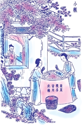 凡攻治小米,扬得其实,舂得其精,磨得其粹。风扬、车扇而外,簸法生焉。其法篾织为圆盘,铺米其中,挤匀扬播。轻者居前,簸弃地下;重者在后,嘉实存焉。凡小米舂、磨、扬、播制器,已详《稻》《麦》之中。唯小碾一制在《稻》《麦》之外。北方攻小米者,家置石墩,中高边下,边沿不开槽。铺米墩上,妇子两人相向,接手而碾之。其碾石圆长如牛赶石,而两头插木柄。米堕边时,随手以小彗扫上。家有此具,杵臼竟悬也。
