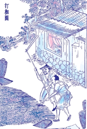 豆类收获后,量少的用打枷脱粒,如果量多,省力的办法仍然是铺在晒场上,在烈日下晒干,用牛拉石磙来脱粒。打豆枷用竹竿或木杆作柄,柄的前端钻个圆眼,拴上一条长约三尺的木棒。把豆铺在场上,手执枷柄甩打。豆打落后,用风车扬去荚叶,再过筛,得到的饱满豆粒就可入仓了。所以说,芝麻用不着舂和磨,豆类用不着磨和碾。