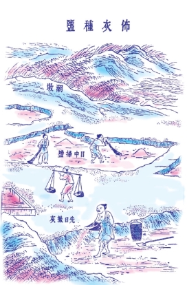 一法:高堰地,潮波不没者,地可种盐。种户各有区画经界,不相侵越。度诘朝无雨,则今日广布稻、麦稿灰及芦茅灰寸许于地上,压使平匀。明晨露气冲腾,则其下盐茅勃发。日中晴霁,灰、盐一并扫起淋煎。