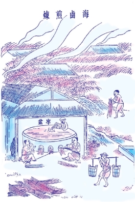 煎盐的锅古时叫作“牢盆”,也有两种形制。牢盆周围数丈,直径也有一丈多。如用铁制成,则将铁打成叶片,再用铁钉铆合,其底平如盂,边高一尺二寸。接缝处一经卤水内盐分结晶后堵塞,就永远不会泄漏。牢盆下面砌灶烧柴,灶眼多的有十二三个,少的也有七八个,共同烧煮。南方沿海地区有用竹制成的,将竹编成阔一丈、深一尺的盆,糊上蜃灰,附于锅背。锅下烧火,卤水滚沸便逐渐成盐。这种盆也叫作盐盆,但不如铁片镶成的牢盆便利。煎炼盐卤汁时,如果没有即时凝结,可将皂角捣碎,搀和粟米糠,卤水沸腾时投入其中搅和,食盐便顷刻结成。加入皂角而使盐凝结,就好像做豆腐时使用石膏一样。
