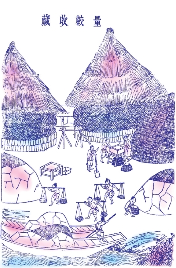 还有一种方法是:将海潮引至深处,预先挖掘一个深坑,上面横架竹或木,上铺苇席,苇席上铺沙。当海潮淹没坑顶而冲过之后,卤气便经过沙子渗入坑内。将沙子和苇席撤去,用灯放在坑内照着。当卤气能把灯冲灭的时候,就可以取卤水出来煎炼了。总之,成功的关键在于能否天晴,如果阴雨连绵十日,盐被迫停产,则称为盐荒。在江苏淮扬一带,人们靠日光把海水晒干,这种经过日晒而自然凝结的盐霜好像马牙的,就叫作大晒盐。不需要煎炼,扫起来就可以食用。此外,顺风从海水中漂来的海草,人们捞起来煎炼而制出的盐叫作蓬盐。