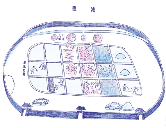 凡池盐,宇内有二, 一出宁夏,供食边镇;一出山西解池,供晋、豫诸郡县。解池界安邑、猗氏、临晋之间,其池外有城堞,周遭禁御。池水深聚处,其色绿沉。土人种盐者,池旁耕地为畦垄,引清水入所耕畦中。忌浊水掺入,即淤淀盐脉。