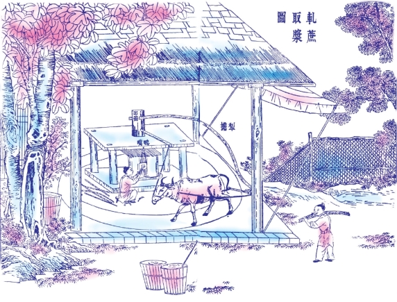 甘蔗经过压榨便会流出蔗浆,再拾起蔗渣插入轴上的鸭嘴处进行第二次压榨,然后再压榨第三次,蔗汁便被榨尽了,剩下的蔗渣可当柴烧。支承双轴的下横板上凿两个深一寸五分的眼,使轴脚不能穿透下横板,以便在板面上承接蔗汁。轴的下端要镶铁以便于转动。接受蔗汁的下横板上有槽,蔗汁通过槽流入缸内。每石蔗汁要加入五合石灰。取蔗汁熬糖时,将三口铁锅排列成“品”字形,先将浓蔗汁集中在一口锅内,再逐步将稀蔗汁加入另两口锅内。如果火力不足,哪怕只少一把柴,也会把糖浆熬成质量低劣的顽糖,只起泡沫而没有用处。