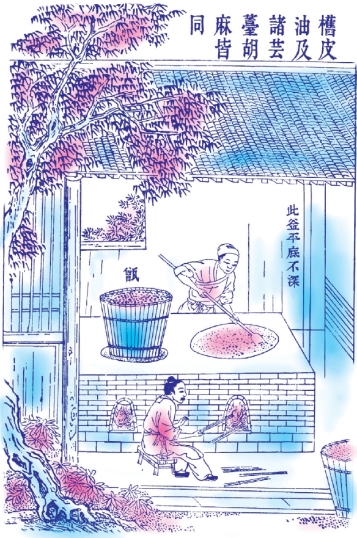 榨具已准备好,则将各种麻籽或菜籽放入锅中,用文火慢炒凡桕、桐之类树上生的,均不必炒,碾碎后蒸之,到透出香气时就取出来,然后碾碎再蒸。炒各种麻籽或菜籽时,宜用平底锅,深六寸即可,将籽仁放进锅中,不停地翻拌。如果锅底太深,翻拌疏慢,则火候不均,会损伤油质。炒锅斜安在灶上,跟蒸锅大不一样。碾槽埋在土内木制的则用铁片包起,上面用木杆穿个圆铁饼,两人对举而推碾。资本宽裕的则用石块砌成牛碾,一牛之力可抵十人。也有些籽实用磨而不用碾,如棉籽之类。碾过之后再筛,择粗的再碾,细的放入锅中受蒸。蒸气透足物料后取出,将其用稻秆或麦秆包裹成饼状,饼外围的箍用铁打成,或用竹篾绞成。饼箍尺寸要与榨具中间空槽的尺寸相符合。