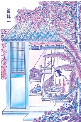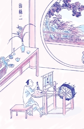 凡缫丝,先要制作缫车。缫车的尺寸、部件及其组合构造都列在后面的插图中。缫丝时首先要将锅内的水煮至极沸,将蚕茧投入锅中,生丝的粗细取决于投茧多少。一个人劳累一整天,可缫丝三十两。如果缫包头巾用的丝,只能得到二十两,因为这种丝比较细长。缫绫罗用的丝,一次要投入锅内二十个蚕茧,缫包头巾用的丝只需投入十几个蚕茧。当茧在锅内滚沸时,用竹签拨动水面,丝绪自会出现。用手牵住绪丝引入竹针眼,先绕过星丁头以竹棍做成,形似香筒,然后将丝勾挂在送丝竿上,再连接到大关车上。
