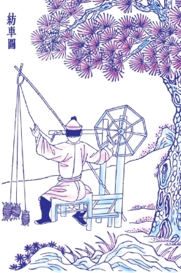 凡丝既籰之后,以就经纬。经质用少而纬质用多。每丝十两,经四纬六,此大略也。凡供纬籰,以水沃湿丝,摇车转铤而纺于竹管之上竹用小箭竹。
