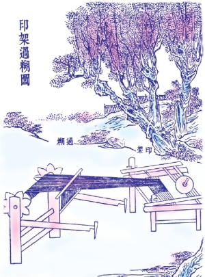 凡糊用面筋内小粉为质。纱、罗所必用,绫、绸或用或不用。其染纱不存素质者,用牛胶水为之,名曰清胶纱。糊浆承于筘上,推移染透,推移就干。天气晴明,顷刻而燥,阴天必借风力之吹也。