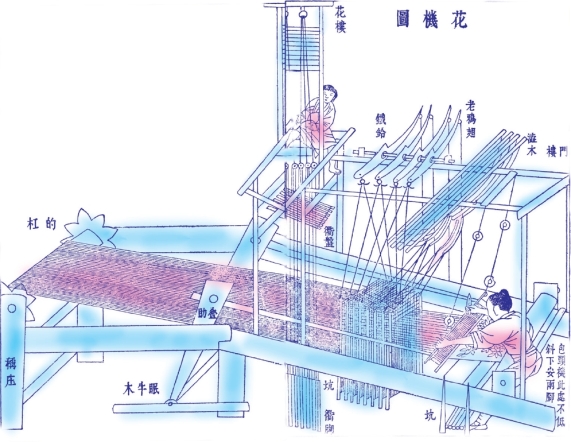 提花机全长约一丈六尺,其中高高隆起的是花楼,中间托着的是衢盘,下面垂着的是衢脚。用加水磨光的竹棍做成,共一千八百根。在花楼的正下方挖一个约两尺深的坑,用来安放衢脚。如果地底下潮湿,可架两尺高的棚来代替。提花的徒工坐立在花楼的木架子上。提花机的末端以的杠卷丝,中间用两根叠助木打纬的摆杆,垂直穿接两根约四尺长的木棍,棍尖分别插入织筘的两端。