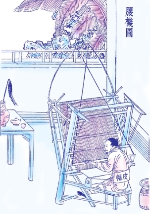 织杭西、罗地等绢,轻素等绸,以及银条、巾帽等纱,都不必使用提花机,而只用小织机就可以了。织匠用一块熟皮作靠背,操作时全靠腰部和臀部用力,所以又叫作腰机。各地织葛、苎麻、棉布的,都用这种织机。织出的布、帛更整齐、结实而有光泽,可惜至今还没有广泛流传。