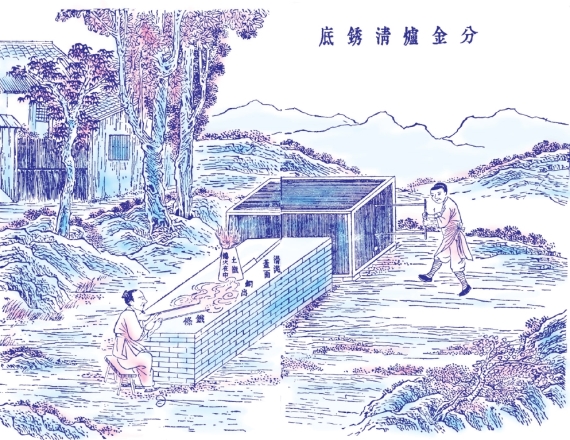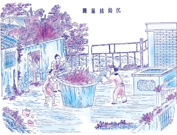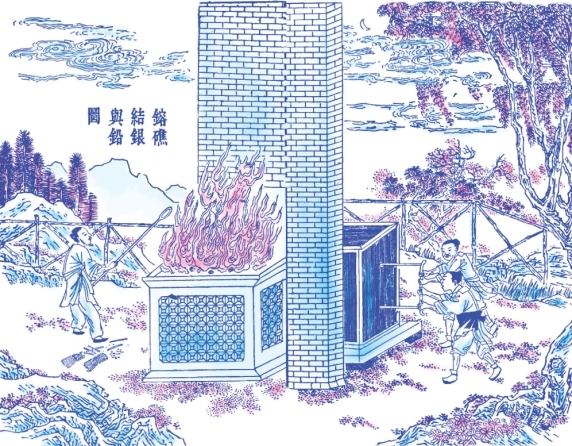 凡礁砂入炉,先行拣净淘洗。其炉土筑巨墩,高五尺许,底铺瓷屑、炭灰,每炉受礁砂二石。用栗木炭二百斤,周遭丛架。靠炉砌砖墙一垛,高阔皆丈余。风箱安置墙背,合两三人力,带拽透管通风。用墙以抵炎热,鼓鞲之人方克安身。炭尽之时,以长铁叉添入。风火力到,礁砂熔化成团。此时银隐铅中⑧,尚未出脱。计礁砂二石熔出团约重百斤。