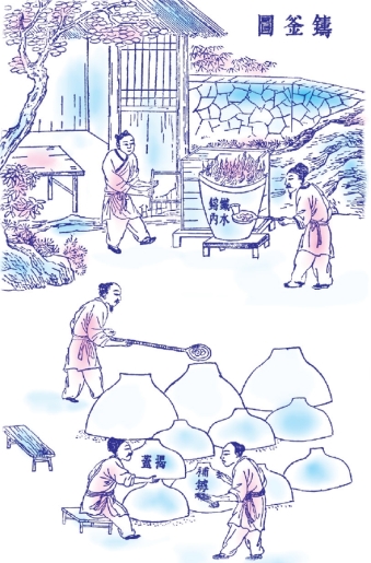 釜是用来储水、受火的容器,人们的日常生活离不开它。铸釜的原料是生铁或者废铸铁器。釜的大小并没有严格固定的规格,常用的釜直径以二尺为准,厚约二分。小釜直径约一尺左右,厚薄不减少。铸釜的模子分为内、外两层,先塑造内模,待其日久干燥后,根据釜的形状大小,再塑造置于内模之上的外模。这种铸模要求塑造功夫非常精确,尺寸稍有偏差,模子就没有用了。