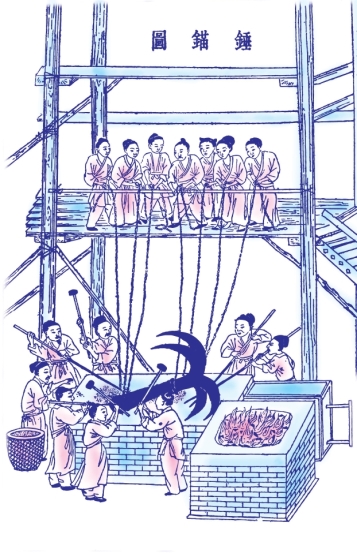 凡舟行遇风难泊,则全身系命于锚。战船、海船有重千钧者。锤法先成四爪,依次逐节接身。其三百斤以内者,用径尺阔砧,安顿炉旁。当其两端皆红,掀去炉炭,铁包木棍夹持上砧。若千斤内外者,则架木为棚,多人立其上共持铁链。两接锚身,其末皆带巨铁圈链套,提起捩转,咸力锤合。合药不用黄泥,先取陈久壁土筛细,一人频撒接口之中,浑合方无微罅。盖炉锤之中,此物其最巨者。