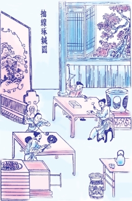 凡针,先锤铁为细条。用铁尺一根,锥成线眼,抽过条铁成线,逐寸剪断为针。先锉其末成颖,用小槌敲扁其本,钢锥穿鼻,复锉其外。然后入釜,慢火炒熬。炒后以土末入松木火矢、豆豉三物掩盖,下用火蒸。留针二三口插于其外,以试火候。其外针入手捻成粉碎,则其下针火候皆足。然后开封,入水健之。凡引线成衣与刺绣者,其质皆刚。唯马尾刺工为冠者,则用柳条软针。分别之妙,在于水火健法云。