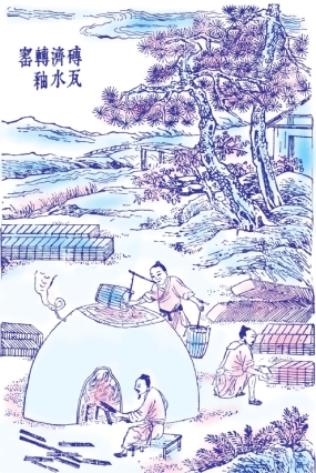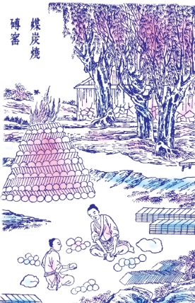 凡砖成坯之后,装入窑中。所装百钧则火力一昼夜,二百钧则倍时而足。凡烧砖有柴薪窑,有煤炭窑。用薪者出火成青黑色,用煤者出火成白色。凡柴薪窑巅上侧凿三孔以出烟,火足止薪之候,泥固塞其孔,然后使水转釉。凡火候,少一两,则釉色不光;少三两,则名嫩火砖,本色杂现,他日经霜冒雪,则立成解散,仍还土质。火候多一两则砖面有裂纹;多三两则砖形缩小拆裂,屈曲不伸,击之如碎铁然,不适于用。巧用者以之埋藏土内为墙脚,则亦有砖之用也。凡观火候,从窑门透视内壁,土受火精,形神摇荡,若金银熔化之极然,陶长辨之。
