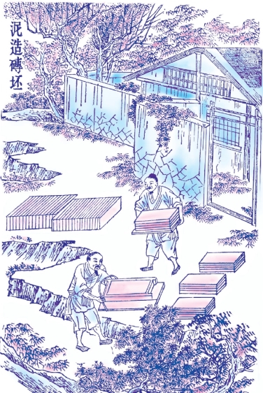 和泥造砖,也要挖取地下的黏土,对土色加以鉴别。黏土一般有蓝、白、红、黄几色,福建、广东多红泥,蓝色的叫善泥,浙江较多,均以黏而不散、粉细而不含沙为上料。汲上水来将黏土滋润,再赶几头牛去践踏,踩成稠泥。然后把稠泥填满木框之中,用铁线弓削平其表面,脱下模子就成砖坯了。