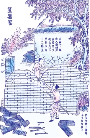 瓷器坯经过画彩、过釉之后,装入匣钵之中装时手持坯器,若用力稍重,后来烧出的瓷器就会凹陷变形,不再复原。匣钵是用粗泥造成的,其中每一泥饼托住一件瓷坯,底下空的部分用沙填实。大件的瓷坯一个匣钵只能装一个,小件的瓷坯一个匣钵可以装十几个。好的匣钵可以装烧十多次,差的一两次就坏了。把装满瓷坯的匣钵放入窑,然后点火烧窑。窑顶有十二个圆孔,叫作天窗。烧二十四个小时火候就足了。先从窑门点火,烧二十个小时,火力从下向上攻,然后从天窗投入薪柴再烧四个小时,火力从上往下透。瓷器在高温烈火中会软得像棉絮一样,用铁叉取出一件,用以检验火候是否已经足够。辨认火候已足,就停薪止火。合计在一件瓷坯上所费的工夫,要经过七十二道工序才能制成瓷器,其中许多细节还不能尽述。
