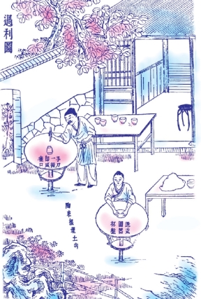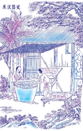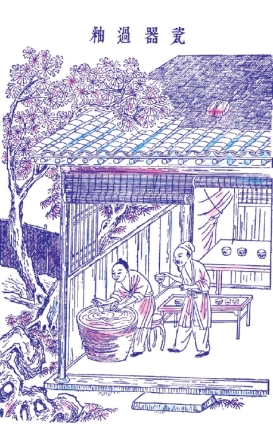 凡饶镇白瓷釉,用小港嘴泥浆和桃竹叶灰调成⑧,似清泔汁泉郡瓷仙用松毛水调泥浆,处郡青瓷釉未详所出,盛于缸内。凡诸器过釉,先荡其内,外边用指一蘸涂弦,自然流遍。凡画碗青料总一味无名异漆匠煎油,亦用以收火色。此物不生深土,浮生地面,深者掘下三尺即止,各直省皆有之。亦辨认上料、中料、下料,用时先将炭火丛红煅过。上者出火成翠毛色,中者微青,下者近土褐。上者每斤煅出只得七两,中下者以次缩减。如上品细料器及御器龙凤等,皆以上料画成,故其价每石值银二十四两,中者半之,下者则十之三而已。