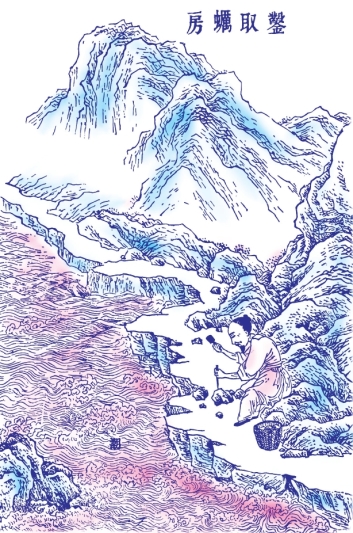 在海滨靠水的石山之处,由于海浪长期冲击,生长出一种蛎房,福建一带称为“蚝房”。年深日久后,这种蚝房可长到数丈长、数亩宽,外形崎岖不平,如同假石山。蛤蜊一类被冲压到岩石似的蛎房中,久之消化成肉团,名叫蛎黄,味道非常鲜美。煅烧蛎灰的人,手执锤和凿,涉水将蛎房凿取下来药铺所售的牡蛎,就是其碎块,堆起煤将蛎壳架火焚烧,与前述烧石灰的方法相同。用蛎灰黏砌城墙、桥梁,或与桐油调和造船,功用都与石灰相同。有人误以为蚬灰即蛤蜊粉就是牡蛎灰,这是没有考察客观事物的真相所造成的。
