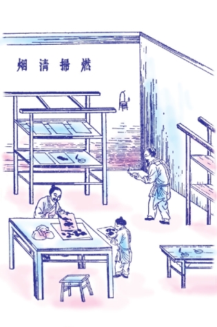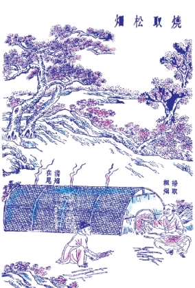烧松木取烟,先把砍下的松木截成一定的尺寸,再在地上用竹篾搭一个圆顶棚屋,就像船上的遮雨篷那样,逐节连接成十多丈长。其内外与接口都要用纸和草席糊紧密封。每隔几节,留出一个小孔出烟,竹棚下接地处要盖上泥土,篷内砌砖要预先设计烟道。将截断的松木放在棚内燃烧数日,停烧、冷却后,便可进去扫刮了。烧松烟时,点燃松木与放烟都是从头节开始,再逐节进行,一直到尾节。尾部一二节中结成的烟叫作清烟,是制作优质墨的原料。中部各节内结成的烟叫作混烟,用作普通墨料。最前面的一二节内,只能刮取烟子,卖给印书的店家,仍要磨细后才能用。其他的就供给漆工、粉刷工作黑色颜料使用。