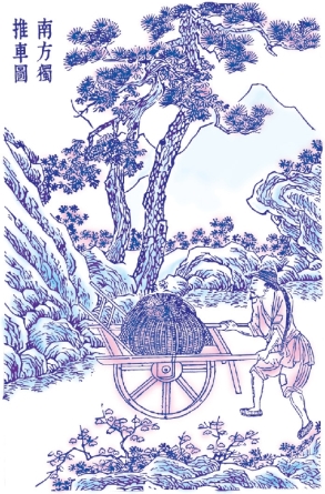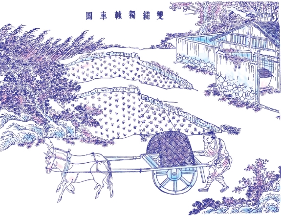 此外,牛车以载刍粮,最盛晋地。路逢隘道,则牛颈系巨铃,名曰报君知,犹之骡车群马尽系铃声也。又北方独辕车,人推其后,驴曳其前,行人不耐骑坐者,则雇觅之。鞠席其上以蔽风日。人必两旁对坐,否则欹倒。此车北上长安、济宁,径达帝京。不载人者,载货约重四五石而止。其驾牛为轿车者,独盛中州。两旁双轮,中穿一轴,其分寸平如水。横架短衡,列轿其上,人可安坐,脱驾不欹。其南方独轮推车,则一人之力是视。容载两石,遇坎即止,最远者止达百里而已。其余难以枚述。但生于南方者不见大车,老于北方者不见巨舰,故粗载之。