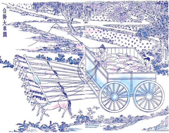 四轮大车运载量为五十石,驾车的骡马,多的有十二匹或十匹,少的也有八匹。执鞭驾车的人站在车厢中间的高处。车前的马分为两组战车以四匹马为一组,靠外的两匹叫作骖,居中的两匹叫作服,纠绞黄麻为长绳,分别系住马颈的后部,套马的绳在后面合拢并收入到衡的两旁。驾车人手执的长鞭是用麻绳做的,约七尺长,鞭杆也有七尺长。看到有不卖力气的马,就挥鞭打到它身上。车厢内由两个识马性和会掌绳子的人负责踩绳。如果马跑得太快,就要立即踩住缰绳,否则会有翻车之祸。车在行进时,遇到前面有行人应避开,驾车人急速发出吆喝声,则群马都会停下来。马的缰绳要收拢,穿过车辕横木入车厢之处,都用牛皮束缚,这就是《诗经》中所说的“胁驱”。