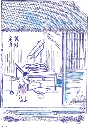 凡造弓,视人力强弱为轻重。上力挽一百二十斤,过此则为虎力,亦不数出。中力减十之二三,下力及其半。彀满之时皆能中的。但战阵之上洞胸彻札,功必归于挽强者。而下力倘能穿杨贯虱⑪,则以巧胜也。凡试弓力,以足踏弦就地,称钩搭挂弓腰,弦满之时,推移秤锤所压,则知多少。其初造料分两,则上力挽强者,角与竹片削就时,约重七两。筋与胶、漆与缠约丝绳,约重八钱,此其大略。中力减十之一二,下力减十之二三也。