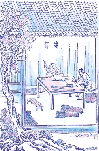 凡箭笴,中国南方竹质,北方萑柳⑫质,北虏桦质,随方不一。竿长二尺,镞长一寸,其大端也。凡竹箭削竹四条或三条,以胶黏合,过刀光削而圆成之。漆、丝缠约两头,名曰“三不齐⑬”箭杆。浙与广南有生成箭竹⑭,不破合者。柳与桦杆,则取彼圆直枝条而为之,微费刮削而成也。凡竹箭其体自直,不用矫揉。木杆则燥时必曲,削造时以数寸之木,刻槽一条,名曰“箭端”。将木杆逐寸戛拖而过,其身乃直。即首尾轻重,亦由过端而均停也。