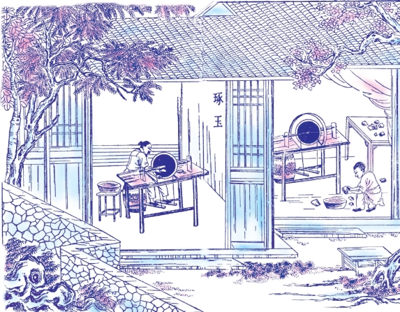 凡玉器琢余碎,取入钿花⑲用。又碎不堪者,碾筛和泥涂琴瑟。琴有玉声,以此故也。凡镂刻绝细处,难施锥刃者,以蟾蜍⑳添画而后锲之。物理制服,殆不可晓。凡假玉以砆碔㉑充者,如锡之于银,昭然易辨。近则捣舂上料白瓷器,细过微尘,以白蔹㉒诸汁调成为器,干燥玉色烨然,此伪最巧云。