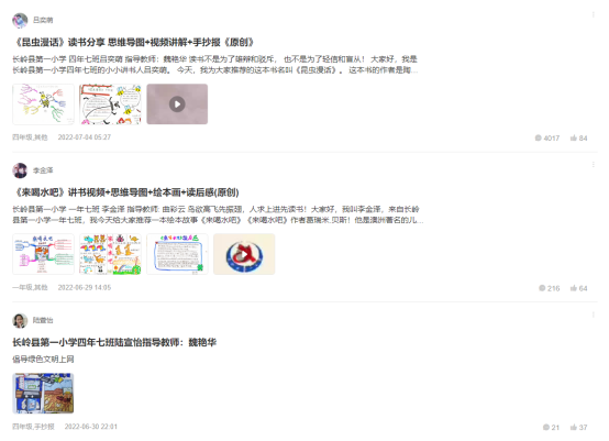 阅读是吸收,写作是倾吐。活动精选统编版教材及教育部基础教育课程教材发展中心推荐阅读书目,保证学生阅读高质量的图书,通过阅读大量积累写作素材,锻炼学生发现写作素材的“眼力”,让阅读为写作蓄力。交互性活动平台为学生提供了作品展示空间,学生阅读完图书后,可以在活动平台分享自己的作品,还可对他人的作品进行评论以及点赞。所有作品都允许配上和主题相关的精美图片、照片及视频。主题多样、形式丰富、风格不限,让学生能充分发挥自己的创作能力。