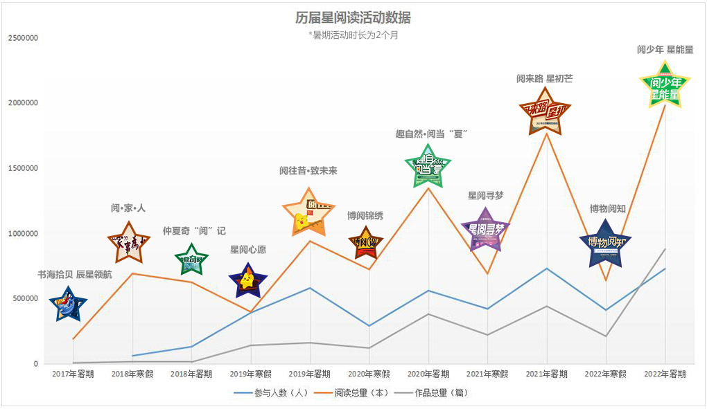 以2022年暑期星阅读活动为例:为期两个月的“阅少年 星能量”2022全国暑期星阅读活动共吸引全国30个省、直辖市、自治区9000余所学校积极参与。活动平台累计访问量达841万余次,共有67万余人参与地图闯关,测评次数达3914952次,326442名“阅读小达人”获得星迹成就证书。全国思问阅读课程加入25955人,章节学习次数379713次,讨论回复数39611个。《2001太空漫游》导读报名家长5494人,章节学习次数69290次,讨论回复数9960个。29224人加入能量日记打卡,知识挑战参与人数达18596人。“阅少年 星能量”暑期星阅读活动共组织了6场直播,累计观看达56529人·次,共获得168154个点赞。活动期间,全国共分享相关话题作品(手抄报、思维导图、故事续写、故事新编、读后感、诗歌、手工、朗诵等)87万余条。
