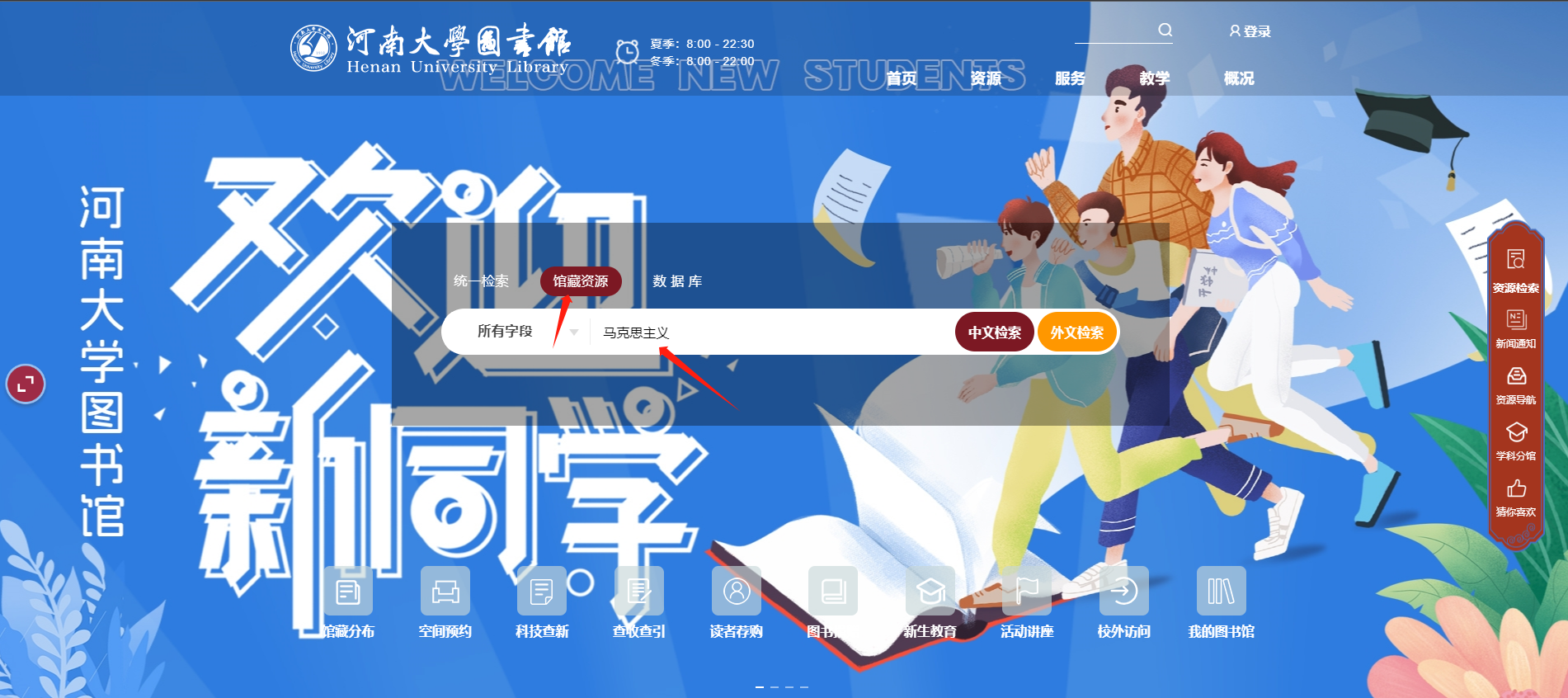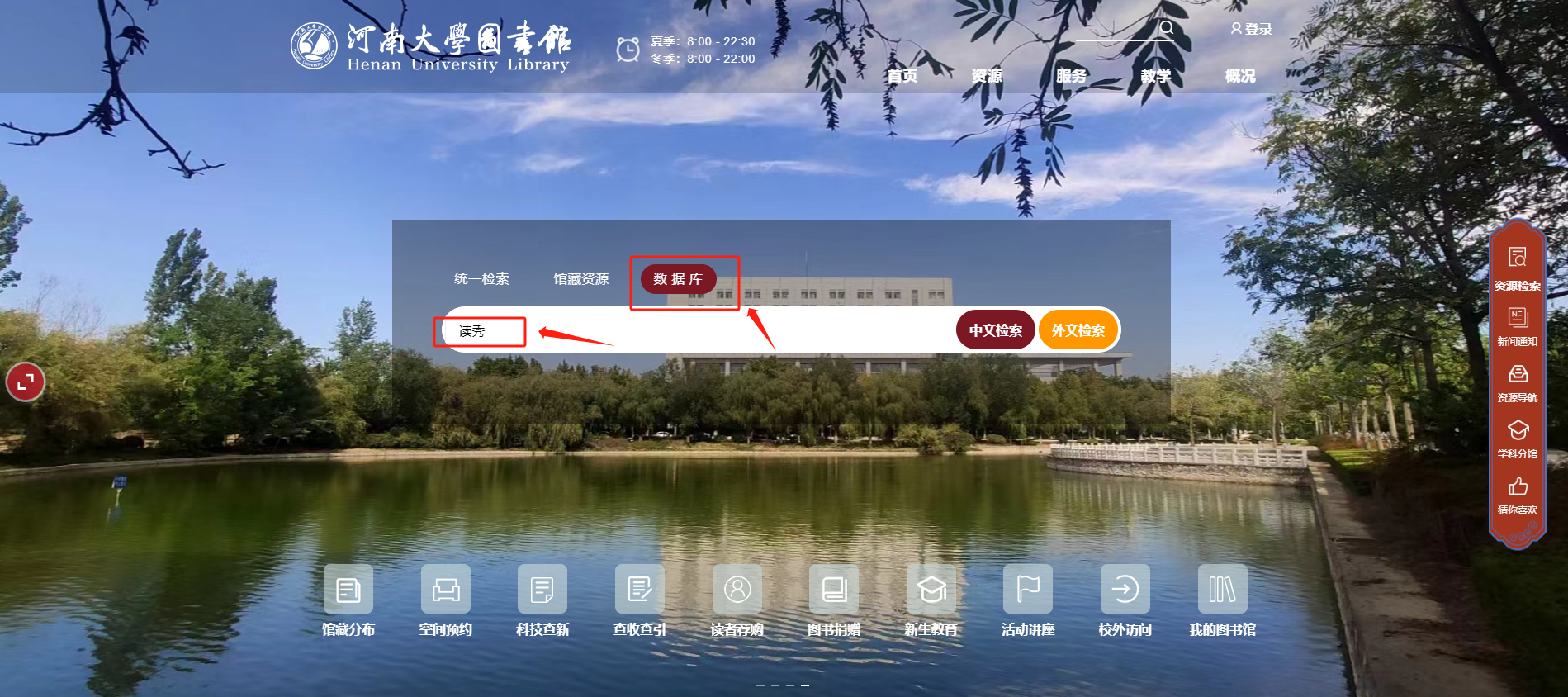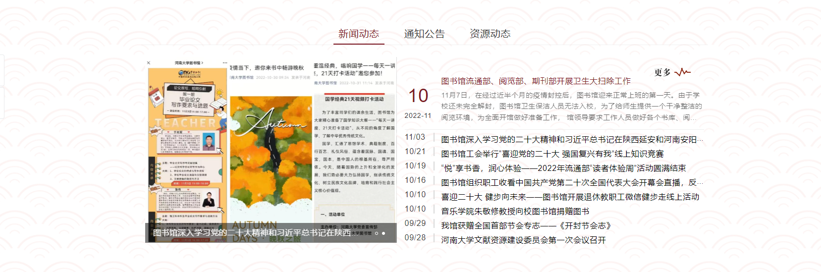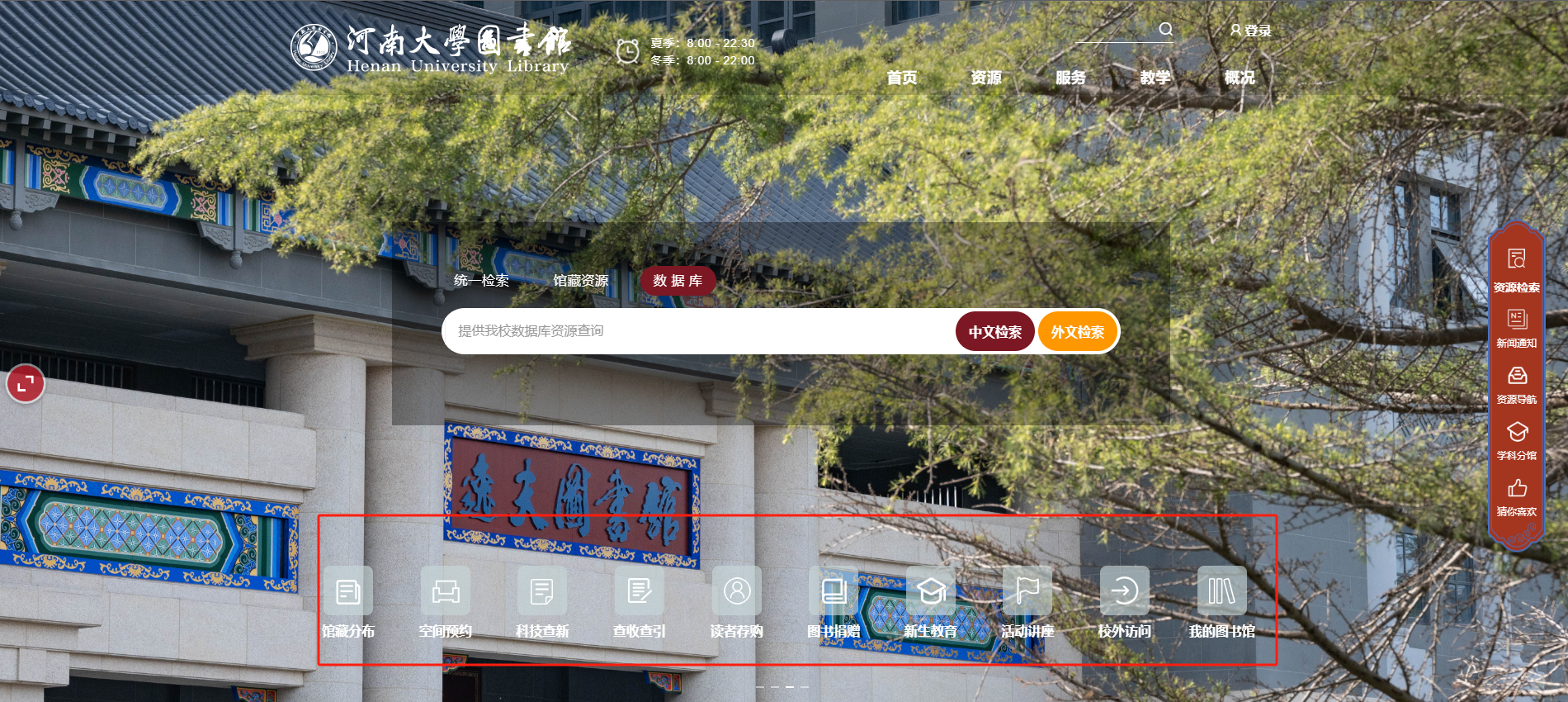 河南大学图书馆智慧门户涵盖十个模块内容:资源搜索、服务指南、新闻动态、通知公告、资源动态、数据条、数据库导航、分馆直达、智能推荐、党建引领。