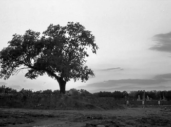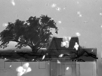 当“搬家”完成,工头驾着卡车行驶时(这里也有一个情节上的硬伤,即冯先生和工头都不知道搬家的目的地),冯先生惊呼前面有个坑。众人不信,以为不过是疯言疯语,却不料看似平坦的土路上真的有一个坑。这时,众人才醒悟过来,冯先生看似一直活在自己的时代和自己的世界里,以一种拒绝交流和妥协的姿态与现代社会对抗,但他反而是现代社会里的一个清醒者,只有他那双不被功利蒙蔽的眼睛才能看到现代化进程中的“坑”。当工头为深陷泥坑里的卡车轮子铲土时,发现了一个铛子,从而与冯先生先前发现的铃铛合二为一,组成了一个完整的传统文化的意象。当几位工人循着冯先生远去的身影回望那棵大槐树时,他们依稀看到一幅电脑绘制出来的水墨动画,一座四合院掩映在飘落的槐花中,耳畔响起老北京走街串巷的民间艺人的叫卖声。几位工人沉醉其中,只是,一阵风过,四合院消失不见,苍翠的大树在夕阳的余晖中虽仍郁郁葱葱,但无端地涂抹上了一层悲情的意味(图43)。