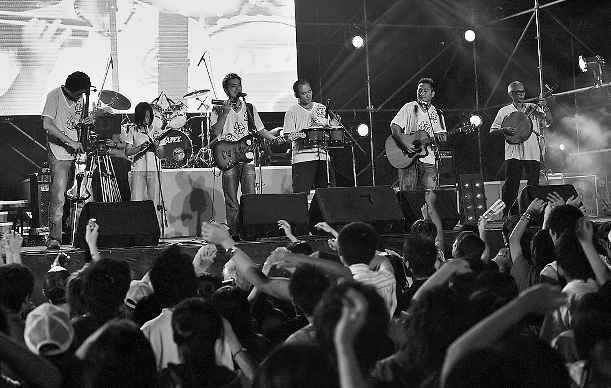 2.(切)中景,正面:阿嘉等人还在发呆,马拉桑已经上了舞台,大大也上了舞台,水蛙犹豫着。