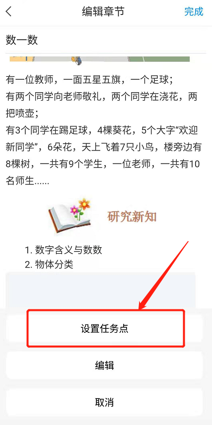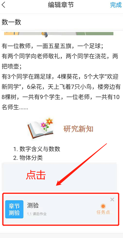 在章节里设置【测验】可设为任务点,若想设其他富媒体为任务点请前往电脑端设置。