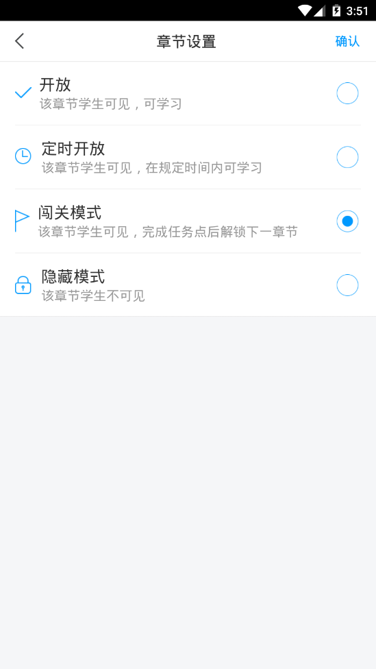 点击【设置】可进入设置任务点,【闯关模式】为章节对学生可见,但必须完成上一章节任务点才可解锁下一章节学习。
