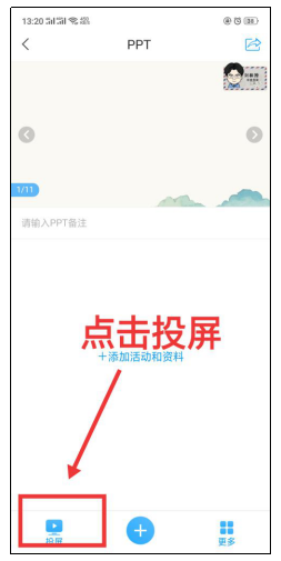常规教学投屏(可投章节、ppt、文档、测验、讨论等)(1)资料上传完毕之后,进入课程中点击ppt,点开所上传的ppt如图所示: