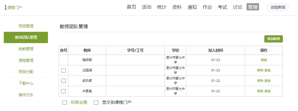第一步:创建课程完毕后,进入详情页——【管理】——【教师团队管理】,进行添加备课组成员的操作