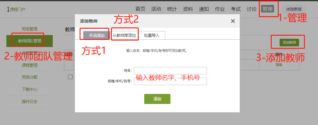 备注:添加备课组成员的方式有两种,第一种在【手动添加】的方式中,直接输入老师的姓名、手机号、即可添加。第二种【从教师库添加】的方式中,直接从后台数据中去选择。