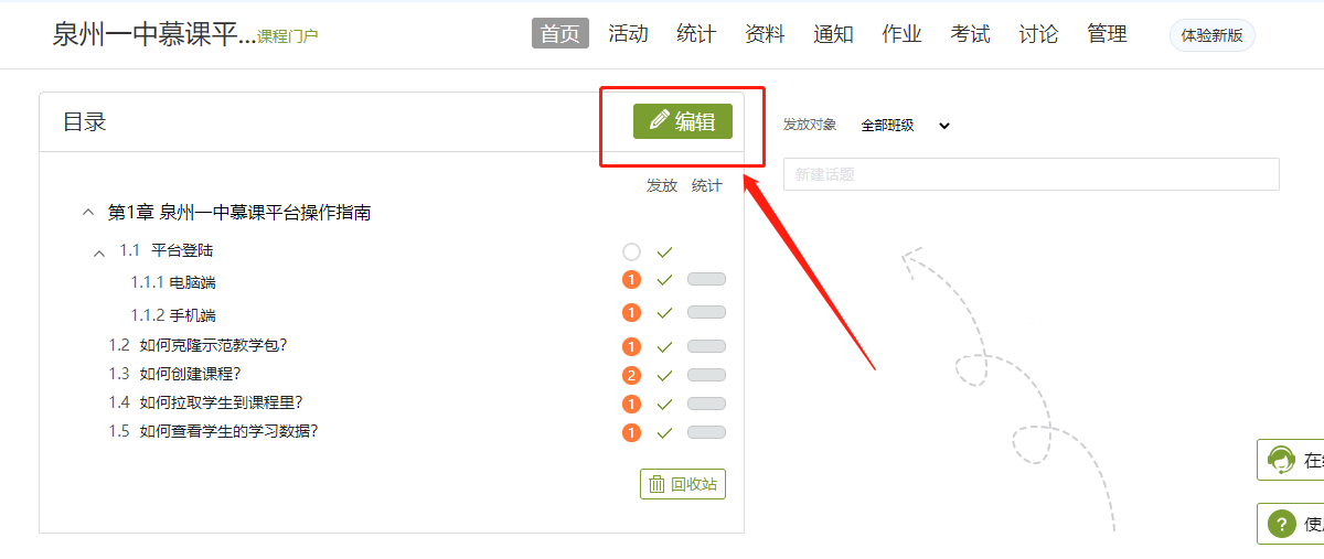 在课程页面,我们可以和移动端看到的一样,对课程章节、资料、通知、作业、考试、讨论进行浏览、编辑和管理。