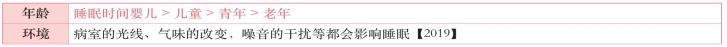 2.合理安排治疗与护理 常规的治疗与护理尽量安排在白天,必须安排在睡眠期间的治疗与护理,则应尽量间隔90分钟(一个正常睡眠周期)。