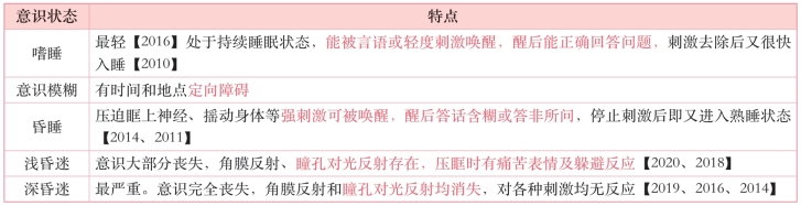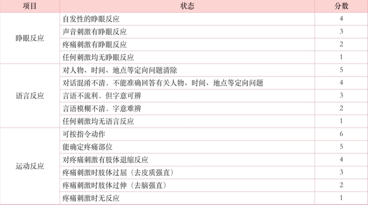 格拉斯哥昏迷评分量表包括睁眼反应、语言反应、运动反应3个项目【2011】。GCS量表总分范围为3~15分,15分表示意识清醒,<3分为深昏迷或脑死亡。